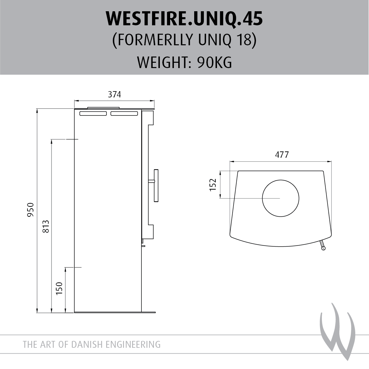 The Uniq 45 Ecodesignwestfire Uniq 45 Ecodesign Woodburning Stove is a high-quality stove from Eurostove, combining elegant design with exceptional performance. With a nominal heat output of 5.0kW, and an impressive efficiency rating of 80%, this stove achieves an A+ energy rating. The stove has a height of 950mm, width of 477mm, depth of 374mm, weighs 90kg. The firebox accommodates logs up to 32cm in length. The stove comes in a stylish anthracite finish.